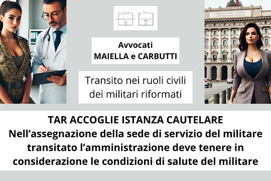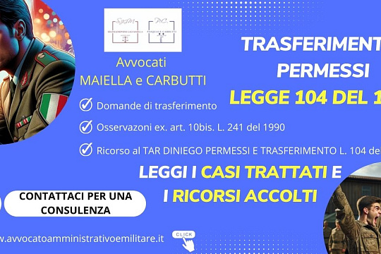 Infatti, molti militari contattano lo studio legale degli avvocati MAIELLA e CARBUTTI chiedendo informazioni circa la possibilità di essere trasferiti per mezzo del ricongiungimento familiare, pur non essendo sposati. Per chiedere una consulenza on line manda una mail a Questo indirizzo email è protetto dagli spambots. È necessario abilitare JavaScript per vederlo.