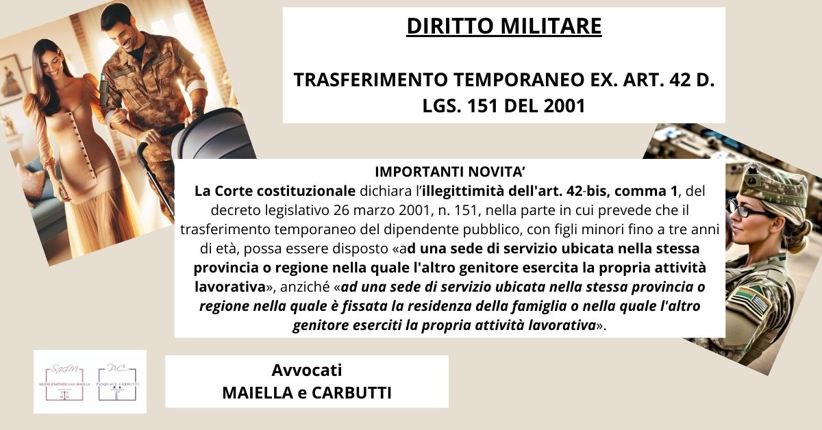Finalmente è stata messa la parola fine ad una vicenda che ha riguardato un Ufficiale dell’Esercito Italiano che è riuscito ad ottenere il trasferimento ex. art. 42 bis del D. Lgs. 151 del 2001, grazie ad un altro ricorso accolto patrocinato dagli avvocati Maiella e Carbutti, esperti in Diritto militare sia amministrativo che penale.