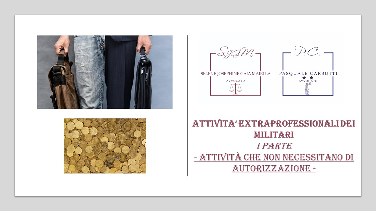 Le attività extraprofessionali per i dipendenti pubblici in generale e per i militari in particolare, consiste in tutte quelle attività per l'appunto estranee al rapporto di impiego principale con la pubblica amministrazione di appartenenza. In particolare troviamo attività che possono essere esercitate senza alcun obbligo informativo, mentre ve ne sono altre che necessitano di autorizzazione ministeriale. Tra le prime rientrano a titolo esemplificativo, le attività di volontariato, quelle legate all'ingegno e le collaborazioni con riviste. Possono essere esercitate effettuato solo una mera comunicazione al proprio Comandante di corpo.