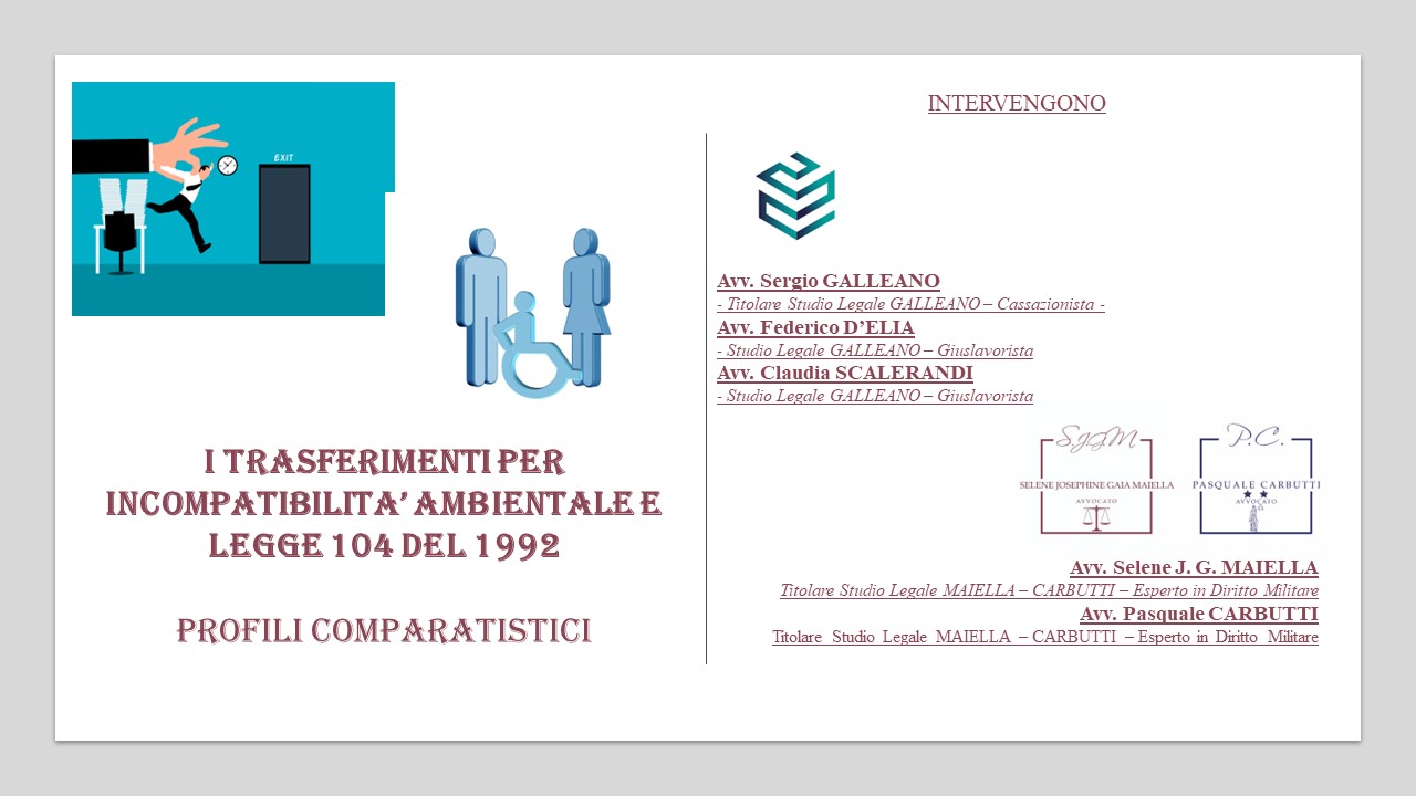 Nuovo incontro con gli Avvocati MAIELLA e CARBUTTI in tema di DIRITTO MILITARE. Questo WEBINAR vedrà anche la partecipazione degli avvocati dello Studio Legale GALLEANO, specializzato e tra i più importanti in DIRITTO DEL LAVORO. Il Webinar si svilupperà attraverso l'inquadramento normativo e giurisprudenziale del Trasferimento d'autorità per incompatibilità ambientale e le relative differenze applicative tra il settore privato, quello pubblico e quello dei militari nello specifico. Il secondo argomento riguarderà l'istituto del trasferimento ai sensi dell'art. 33 co. 5 della L. 104 del 1922. Anche in questo caso l'argomento verrà esposto attraverso un'analisi comparativa tra i diversi settori di impiego e l'analisi della legge da un punto di vista normativo e giurisprudenziale attraverso le sentenze della Cassazione del Consiglio di stato.