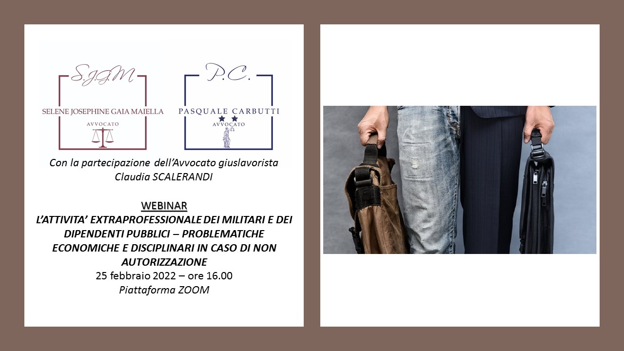 Breve incontro in diretta Facebook e tramite piattaforma Zoom in tema di Diritto Militare. All'interno del webinar sull'attività extraprofessionale dei militari e dei pubblici impiegati in generale, gli Avvocati Carbutti e Maiella, insieme all'avvocato Giuslavorista Claudia Scalerandi, affronteranno il problema connesso ad una mancanza di autorizzazione ovvero al diniego all'esercizio del secondo lavoro. Si affronteranno brevemente quelle che sono le attività consentite, quelle consentite previa comunicazione e quelle che necessitano di autorizzazione ministeriale. Si discuterà, in particolare, delle conseguenze economiche e disciplinari connesse alle violazioni delle disposizioni per il corretto esercizio entro i limiti soggettivi ed oggettivi.