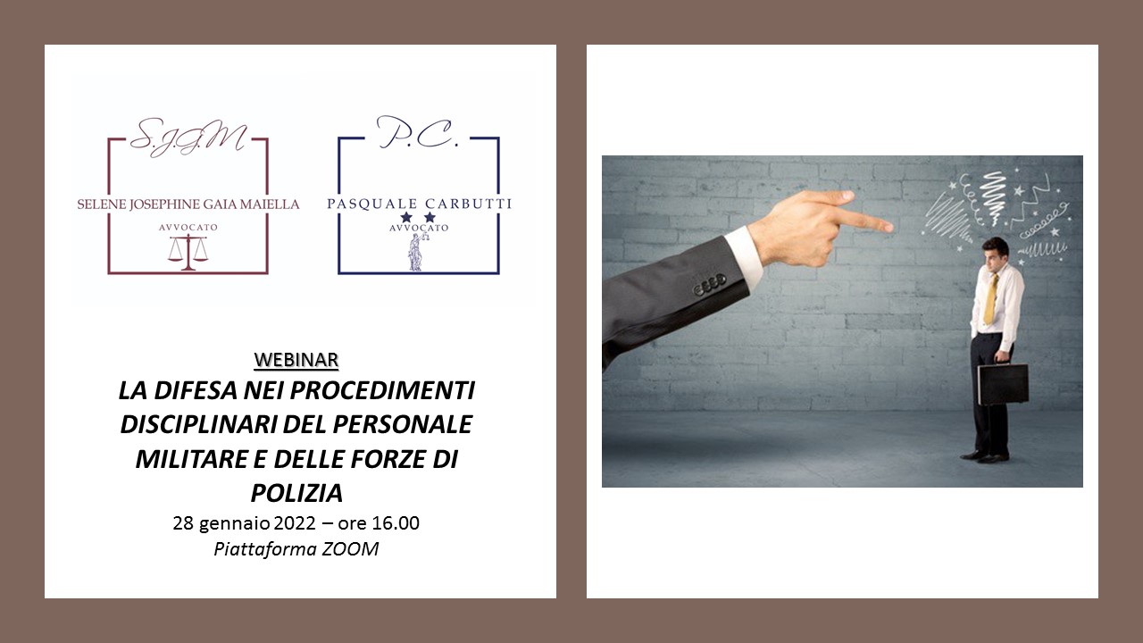 Breve incontro tramite piattaforma ZOOM ed in diretta Facebook, con gli avvocati Carbutti e Maiella, legali dalla pluriennale esperienza in diritto militare, in cui si discuterà della difesa nei procedimenti disciplinari relativi al personale militare e di quello delle forze di polizia ad ordinamento civile. In particolare si affronterà il tema della strategia di difesa, delle memorie difensive e dei ricorsi. Per prenotarsi è sufficiente registrarsi cliccando il link qui sotto.