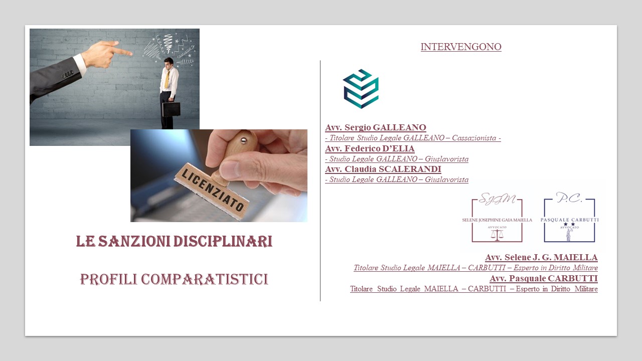 Nuovo incontro con gli Avvocati MAIELLA e CARBUTTI in tema di DIRITTO MILITARE. Questo WEBINAR vedrà anche la partecipazione degli avvocati dello Studio Legale GALLEANO, specializzato e tra i più importanti in DIRITTO DEL LAVORO. Il Webinar si svilupperà attraverso l'inquadramento normativo e giurisprudenziale delle sanzioni disciplinari comminate al dipendente e le relative differenze applicative tra il settore privato, quello pubblico e quello dei militari nello specifico.